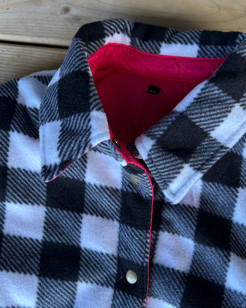 Stay warm in style with our snap-button Shirt Jacket, featuring a cozy fleece white buffalo plaid exterior and our signature pink quilted lining for added warmth without the bulk. Designed to hit just above the knee, this versatile layer blends comfort, function, and effortless style - perfect for everyday wear from fall straight through winter.